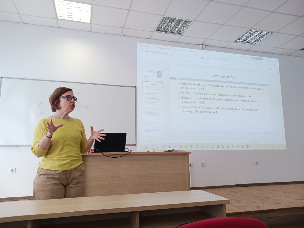Гост-лекторката разгледа историческото развитие на еврейско-испанския език и присъствието му на Балканския полуостров, като предостави богат снимков материал, свързан с присъствието на сефарадските евреи в Белград.