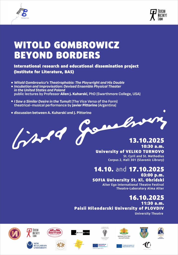 14 октомври 2025 (вторник), 15–16:15 ч. проф. Алън Кухарски (Суортмор колидж, САЩ): Witold Gombrowicz’s Theatrophobia: The Playwright and His Double (Театрофобията на Витолд Гомбрович: драматургът и неговият двойник; 40-минутна лекция с 30-минутна дискусия на английски без превод). Запазете своето място тук.