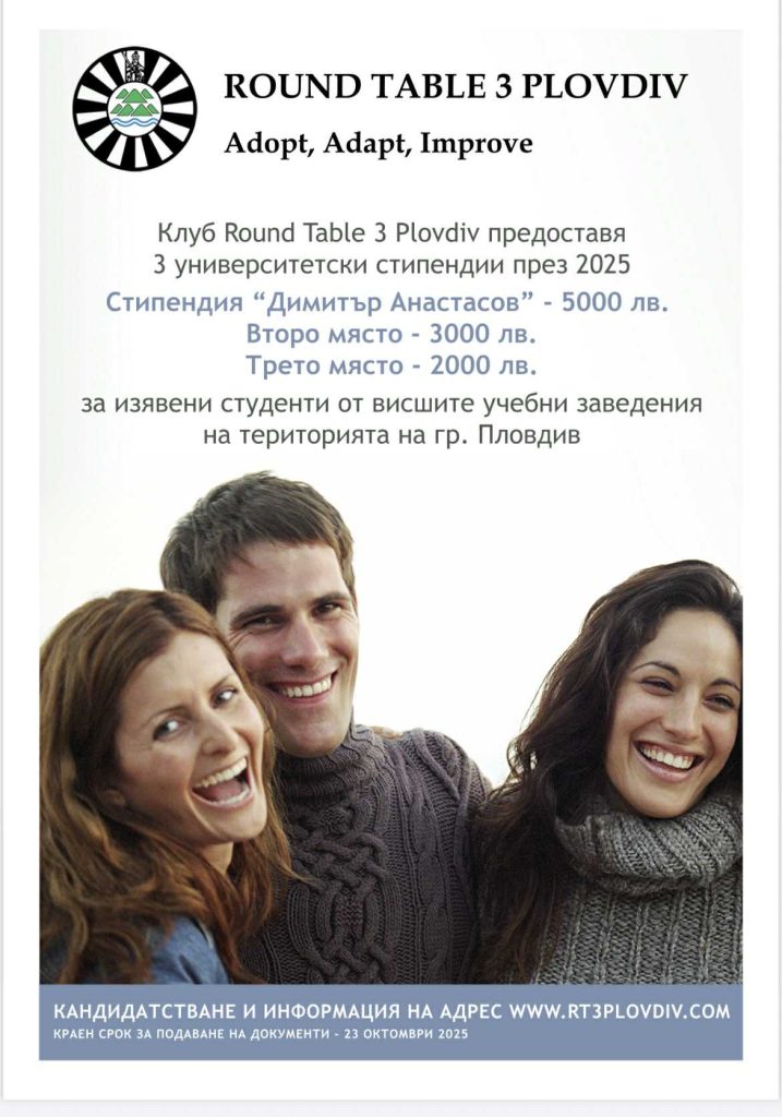 Драги студенти, клуб Round Table 3 Пловдив предоставя 3 университетски стипендии за поредна година. Стипендиите са предназначени за изявени студенти от висшите учебни заведения в град Пловдив. Краен срок за подаване на документи 23/10/2025.
