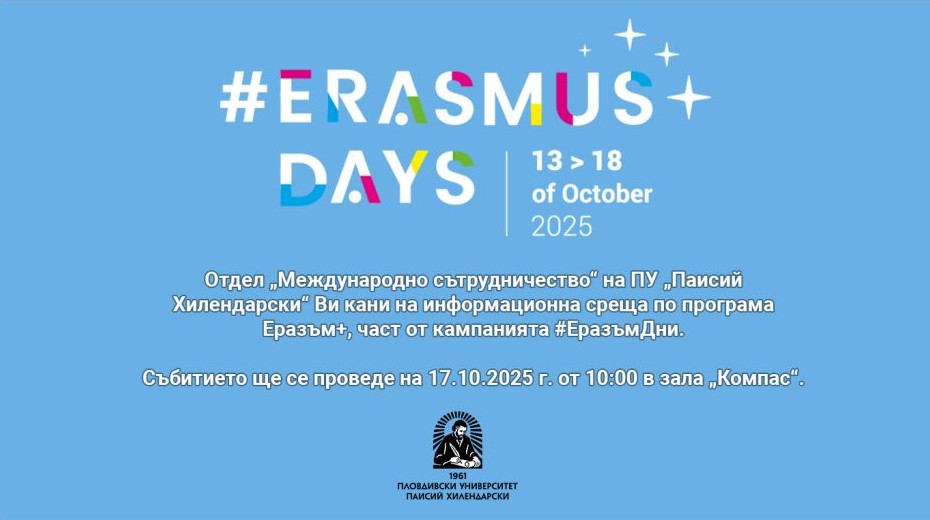Отдел „Международно сътрудничество“ Ви кани на информационна среща за програма „Еразъм“ – част от кампанията #ERASMUSDAYS, с цел нейното популяризиране сред студентите. Събитието ще се проведе на 17.10.2025 г. в зала „Компас“ в Ректората на университета от 10,00 часа.