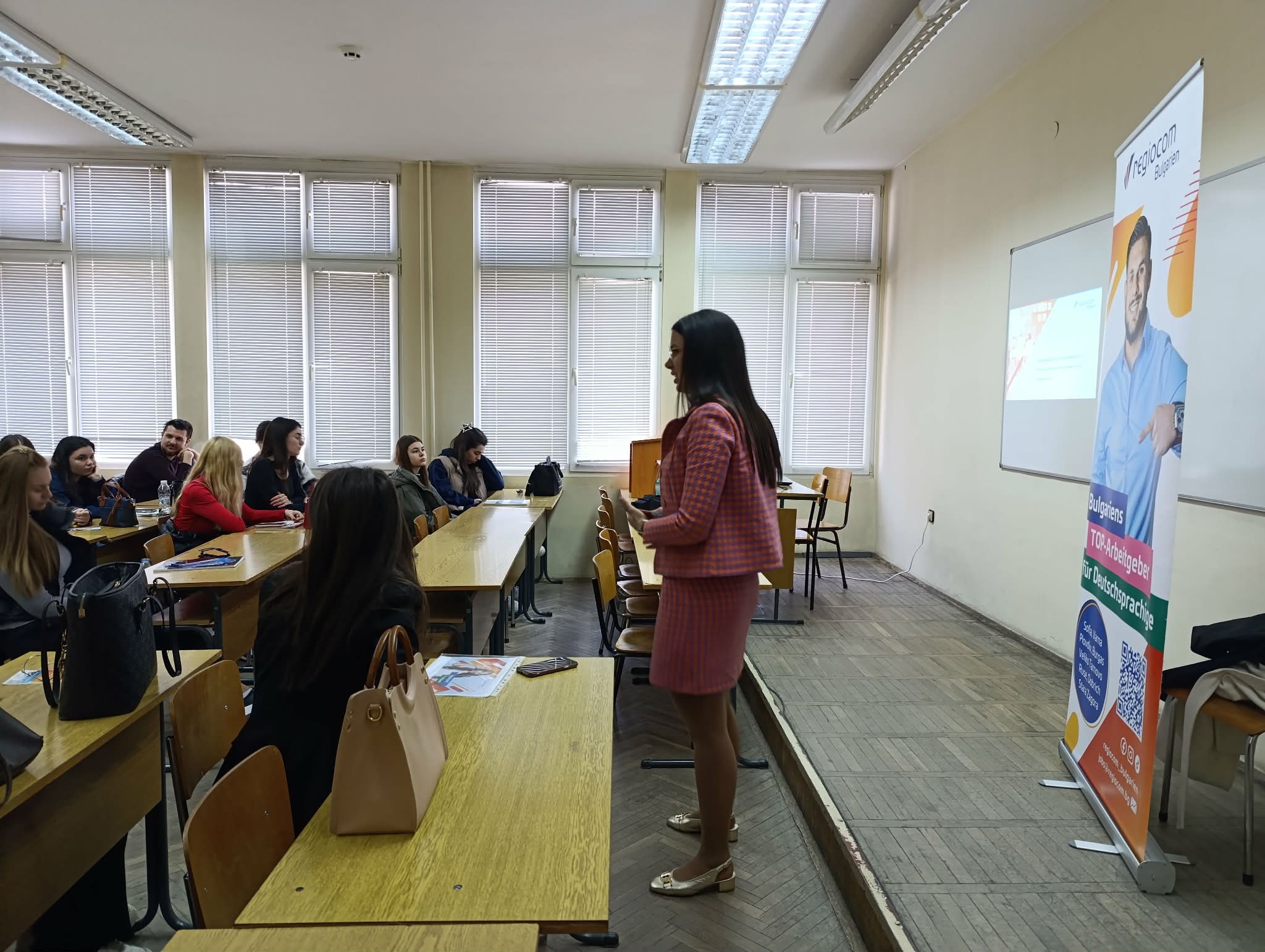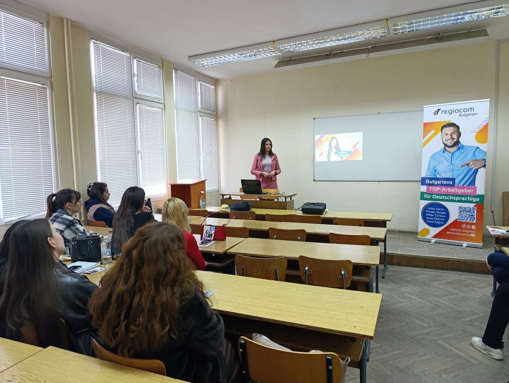 На 17.03.2026 г. в Нова сграда на Пловдивски университет „Паисий Хилендарски“ се проведе среща с представители на фирма Regiocom България. Те запознаха студентите със съществото на обучението и работата във фирмата, като представиха и възможностите за кариерно развитие на студенти от всички специалности, изучаващи немски език.