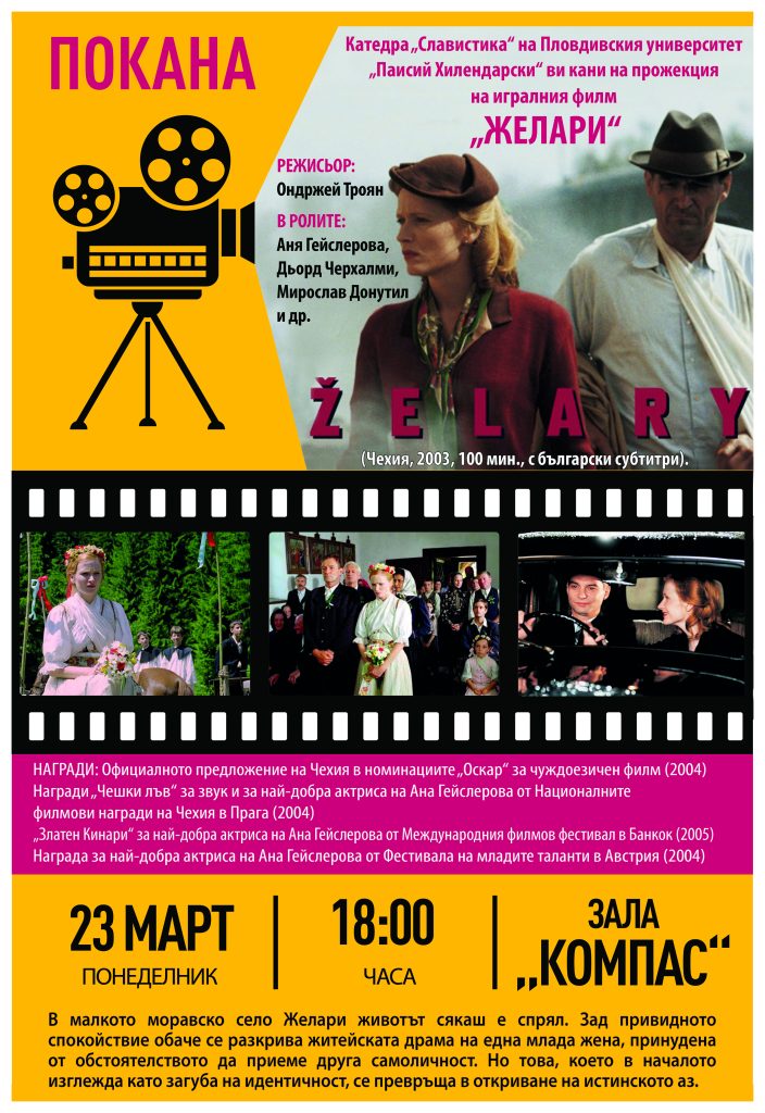Катедра „Славистика“ към Пловдивския университет „Паисий Хилендарски“ Ви кани на прожекция на чешкия игрален филм „Желари“ (Чехия, 2003, 100 мин.), реж. Ондржей Троян.